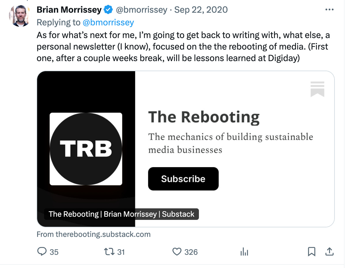 BM: I don’t know if I knew. What I saw in 2020 was that the pendulum was swinging from institutional brands to individual brands, and the business models were rewarding tighter relationships with the audience and making the audience more of a community.