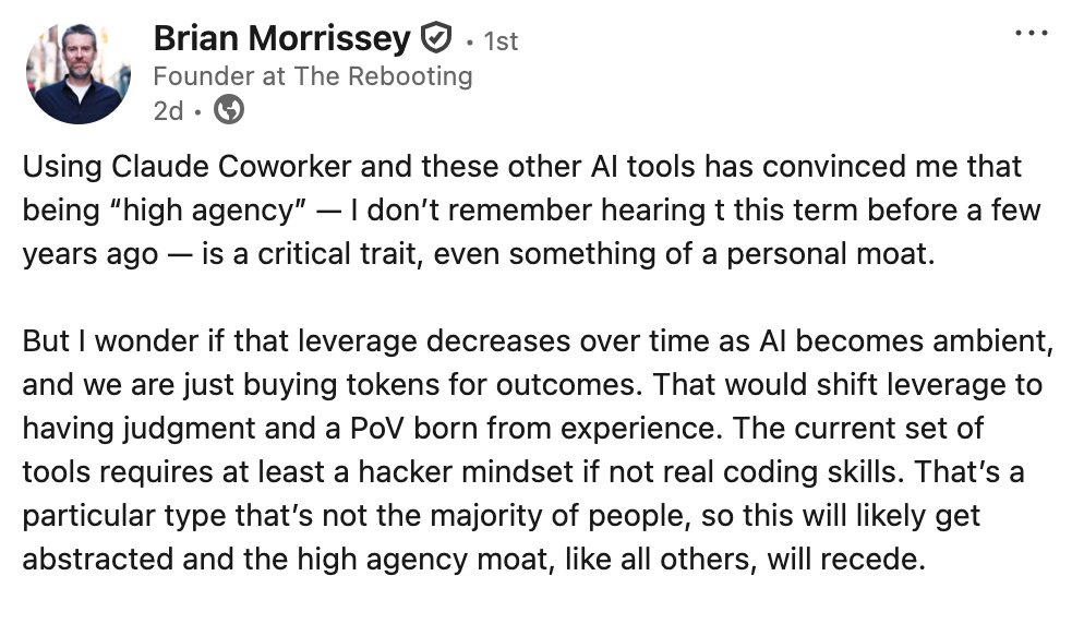KB: I think people don’t know what to post, so they default to the trade show booth. They skip the hard part—forming a POV by having inputs. People don’t value inputs anymore, they’re just trying to produce more. So they have nothing new to say.