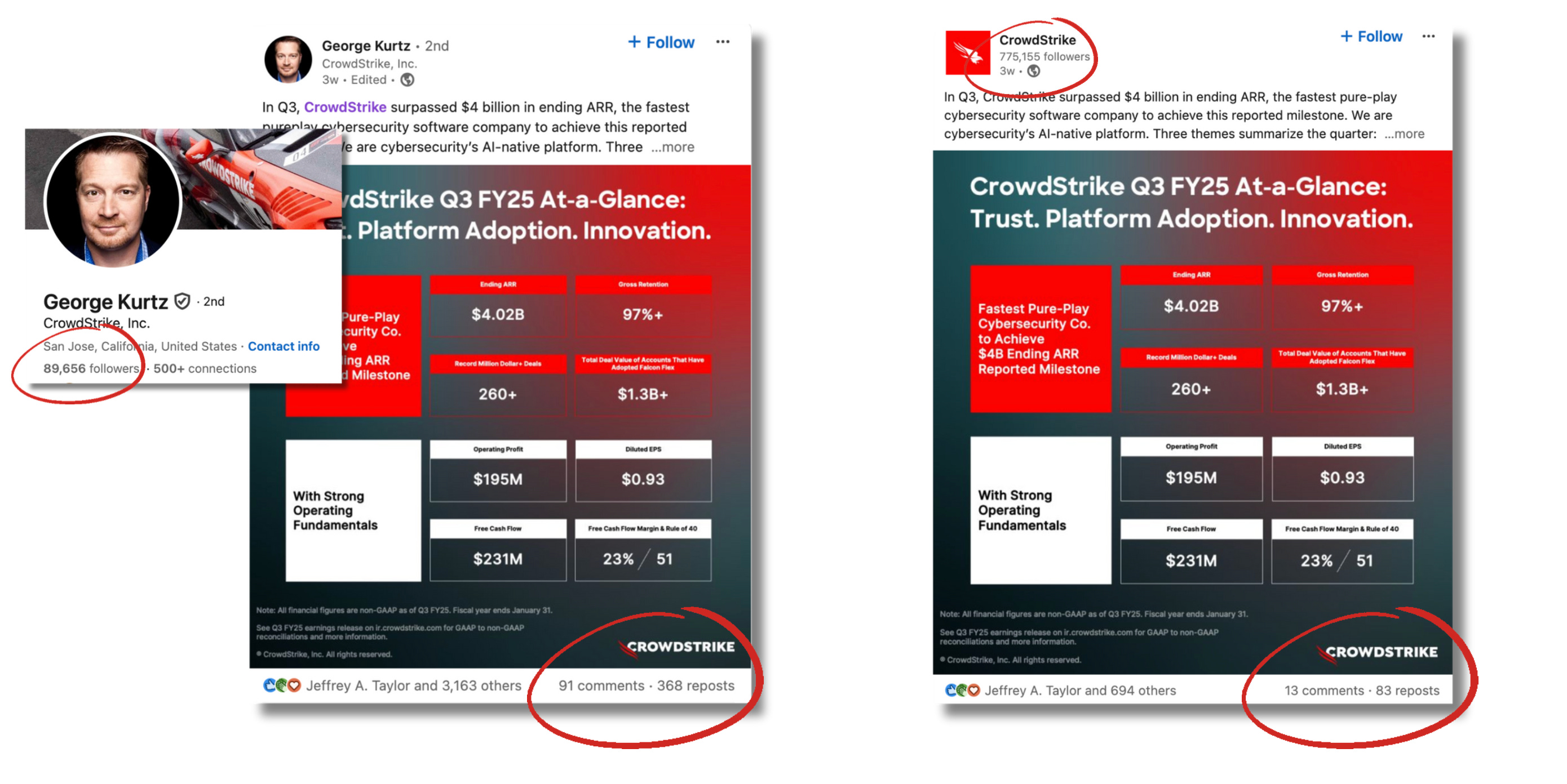CrowdStrike, with 775,000 LinkedIn followers, massive marketing budget, legitimate best-in-class cybersecurity brand, posted their Q3 earnings on their company page. Beautiful graphic, strong numbers, $4 billion in ending ARR, chef’s kiss.